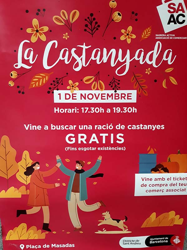 Per la castanyada, el proper 1 de novembre a la plaça Masadas, us oferiran una racció gratuita de castanyes tant sols presentant el ticket de compra del nostre establiment.